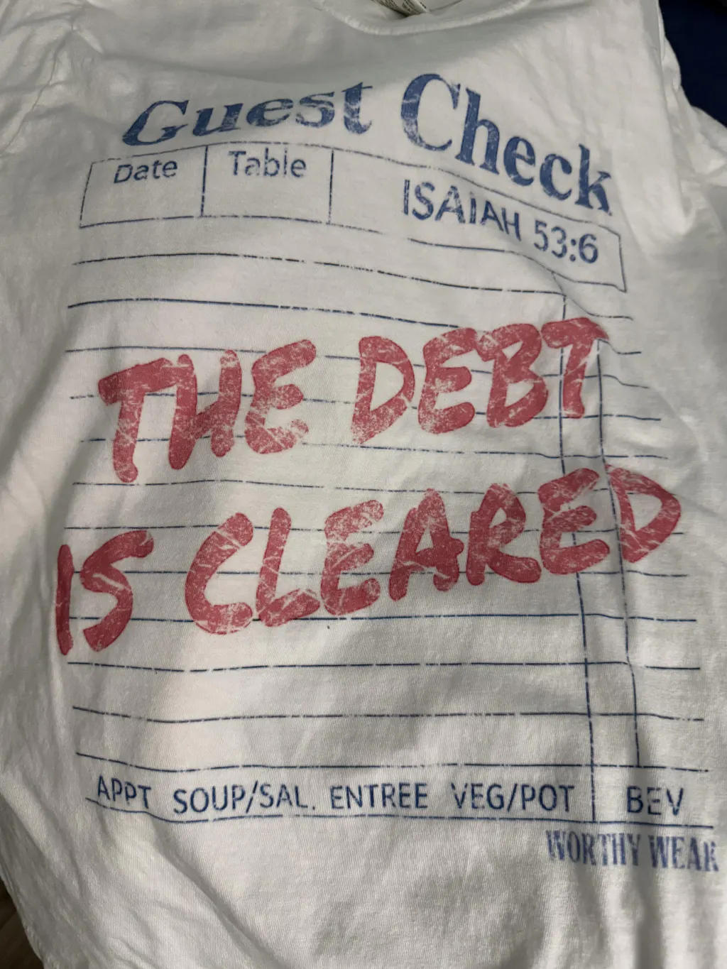 The "The Debt Has Been Cleared" tee is a powerful reminder of the freedom we have in Christ. Featuring a guest check design, this shirt symbolizes the spiritual debt we owed due to sin and how Jesus paid the price on the cross, clearing that debt once and for all. With bold, striking text, it serves as a declaration of gratitude and victory, acknowledging the ultimate sacrifice that granted us forgiveness and new life. Wear it as a testament to the freedom and grace found in God’s mercy. Perfect for those who walk in the freedom of Christ's redemption.